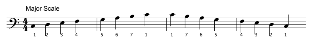 The above example shows C major scale, and uses each degree of the scale. When practicing, repeat the root note at the the start and finish – this keeps the scale in 4/4 time, and means that the scale becomes more musical.