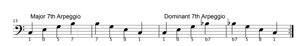 There are three main 7th chords – the Major 7th, Minor 7th and Dominant 7th. The last of these is usually just referred to as ‘the 7th’ chord – e.g. C7. The arpeggios are simply the chord notes played separately. They use notes 1, 3, 5 and 7 (or b7) of the relevant key.